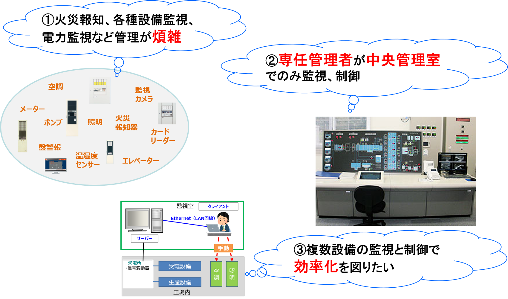 特長① 統合監視型の設備連携例:電力監視と空調・照明設備連携