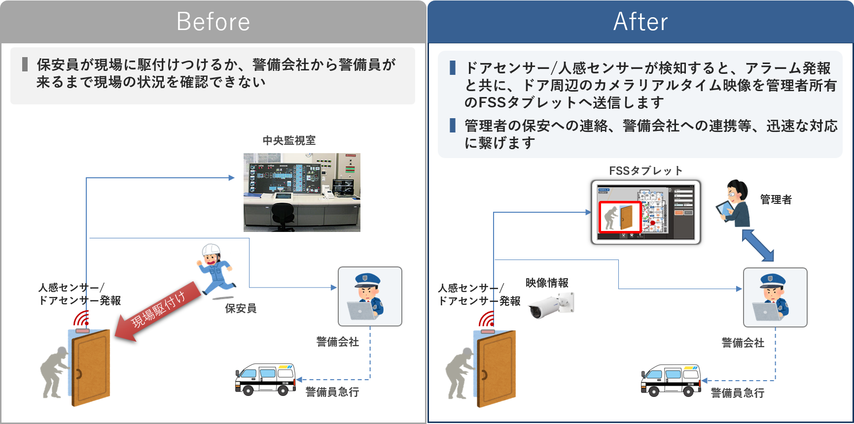 侵入を検知し、FSSタブレットに警報を上げると同時に周辺のカメラ映像を送信。異常時の迅速な対応を実現