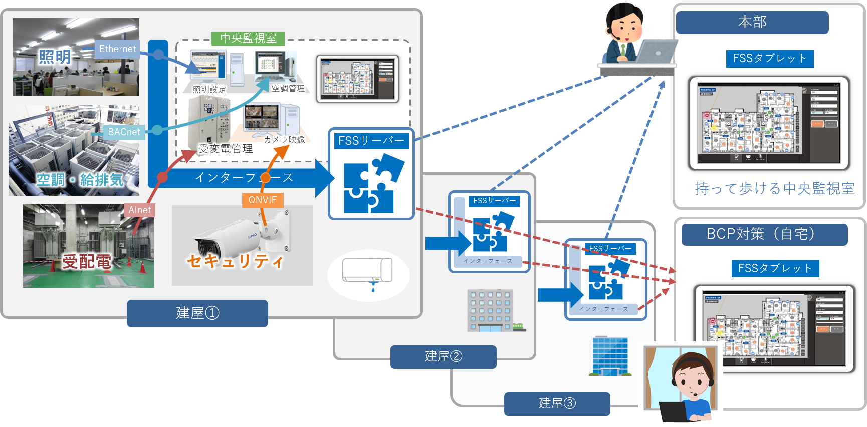 同じタブレットを使用して、FSS管理画面から複数施設の設備機器を一括管理すること「持って歩ける中央監視室」が実現します。