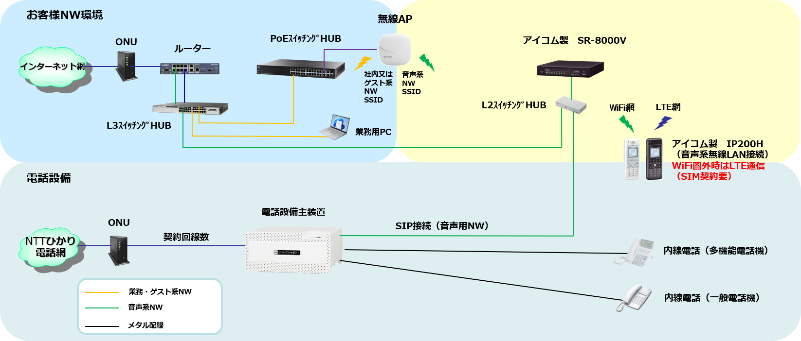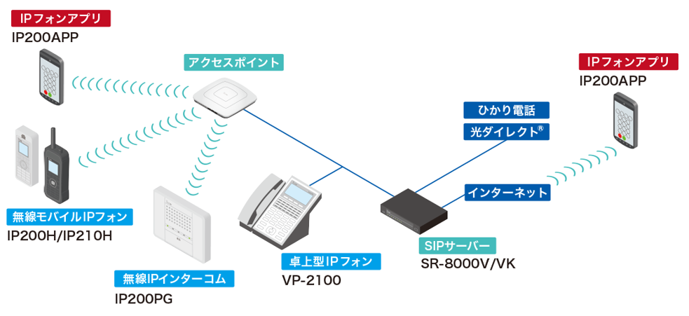 既に構築された電話設備(*1)や無線LAN環境(*2)を利用し、IPモバイルフォンIP200HやスマートフォンIP200APPを利用し内線電話の環境が可能です。