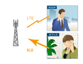 LTE回線を利用して、会社にかかってきた外線電話をスタッフが携帯するP200Hに転送できます。席を外していても、コールバックする必要もなく、タイムリーに対応できます。また、外出先からでも会社の電話番号で取引先に電話をかけることもできます。