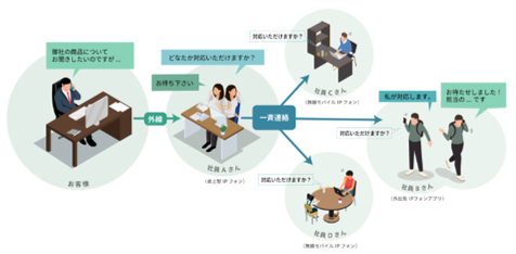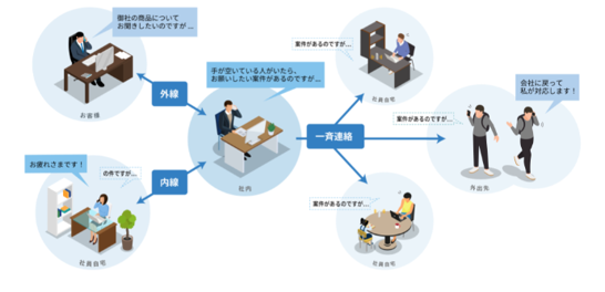 LAN経由で、自席にいなくても内線通話を送受できます。LTE回線を使えば、内線を屋外でも送受可能です。話したい相手が席にいなくて掛けなおしたり、外出先から代表電話にかけて話したい人に取り次いでもらったりする必要がなくなります。